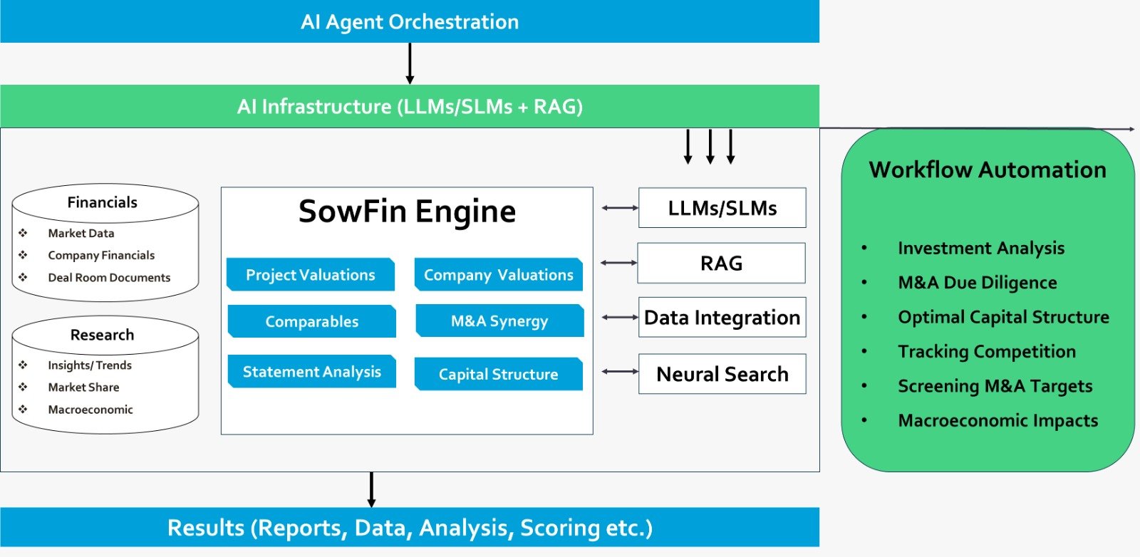 SOWFIN is not a general-purpose chatbot. We use agentic workflows – predefined, finance-specific processes – that ingest structured data, apply corporate finance models, and return outputs in structured formats. Our agents operate with logic and structure, not freeform generation. SOWFIN stands apart by delivering an enterprise grade AI-powered solution that combines robust analysis modules and advanced automation capabilities.
